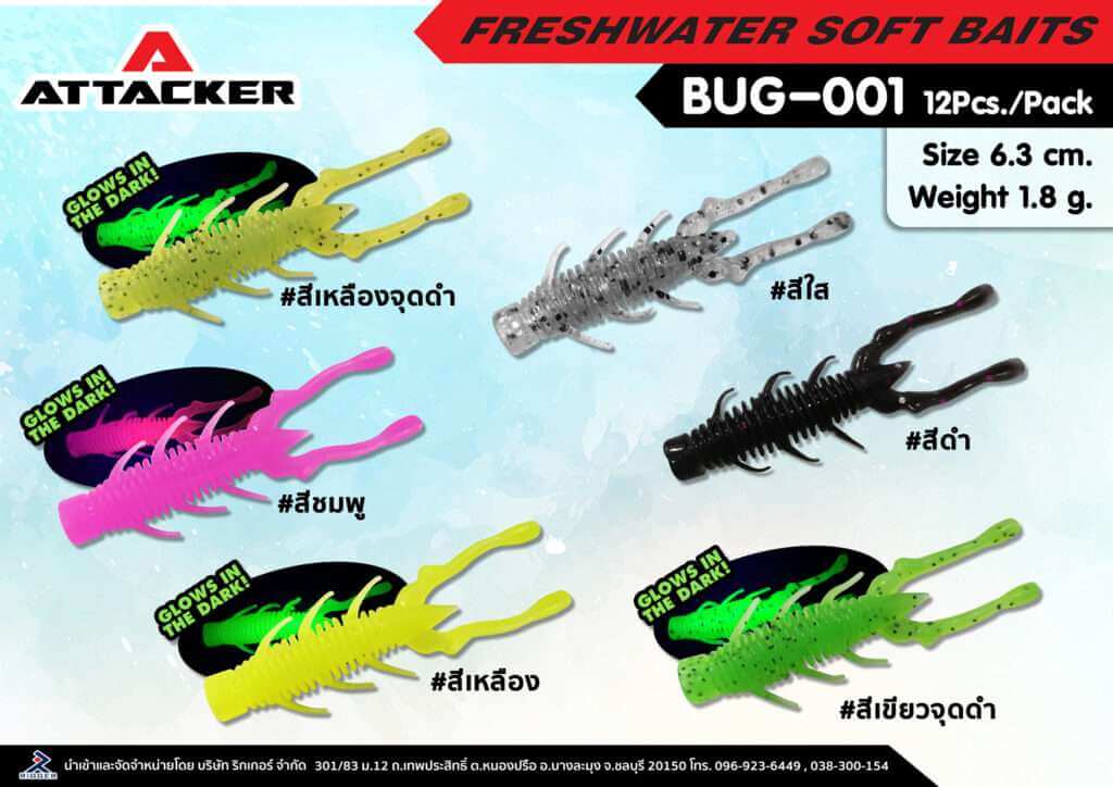 เหยื่อปลอม เหยื่อยาง ปลายาง PREMIUM SOFT BAIT BUG-001 โดยใช้เนื้อยาง TPE ที่เป็นมิตรกับสิ่งแวดล้อม มีคุณสมบัติทนทานต่อการฉีกขาด เนื้อยางของเหยื่อมีความเหนียวนุ่มและยืดหยุ่นต่อการดึง การออกแบบปลายางมีลักษณะที่คล้ายเหมือนแมลง มาพร้อมกับตัวเบ็ดเกี่ยวหนอน สามารถใช้งานได้ทันที