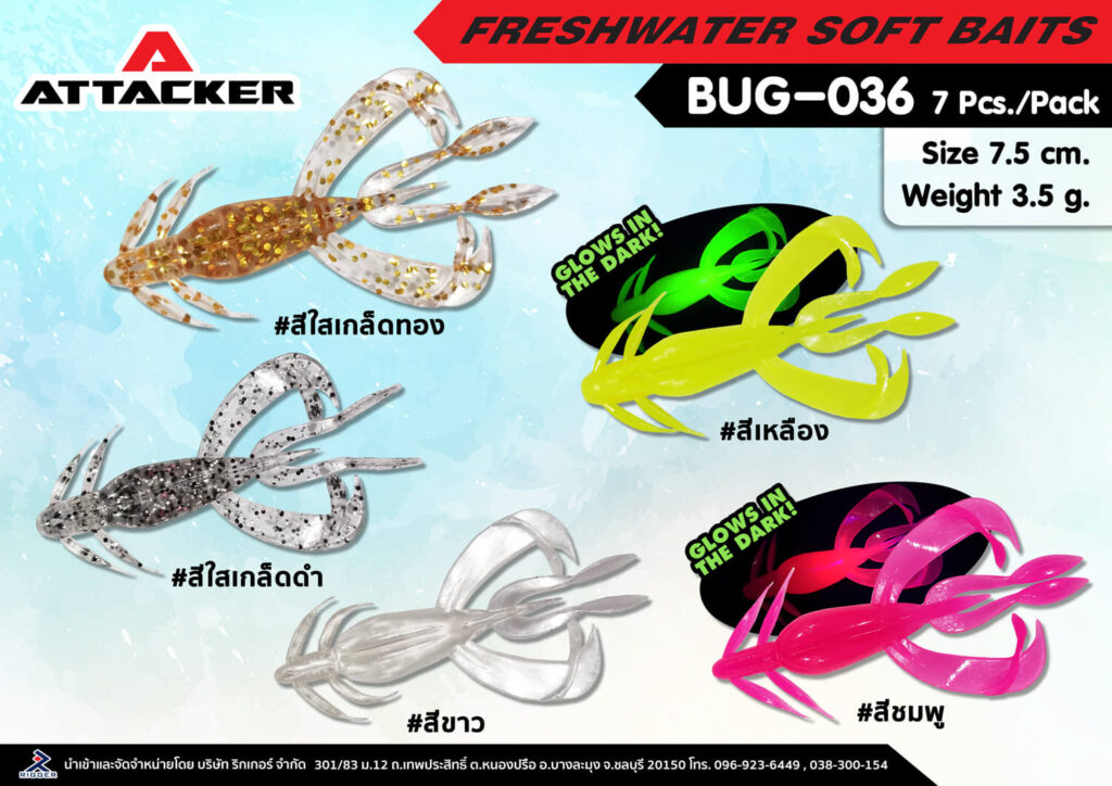 เหยื่อปลอม เหยื่อยาง ปลายาง PREMIUM SOFT BAIT BUG-036 โดยใช้เนื้อยาง TPE ที่เป็นมิตรกับสิ่งแวดล้อม มีคุณสมบัติทนทานต่อการฉีกขาด เนื้อยางของเหยื่อมีความเหนียวนุ่มและยืดหยุ่นต่อการดึง การออกแบบปลายางมีลักษณะที่คล้ายเหมือนแมลง มาพร้อมกับตัวเบ็ดเกี่ยวหนอน สามารถใช้งานได้ทันที