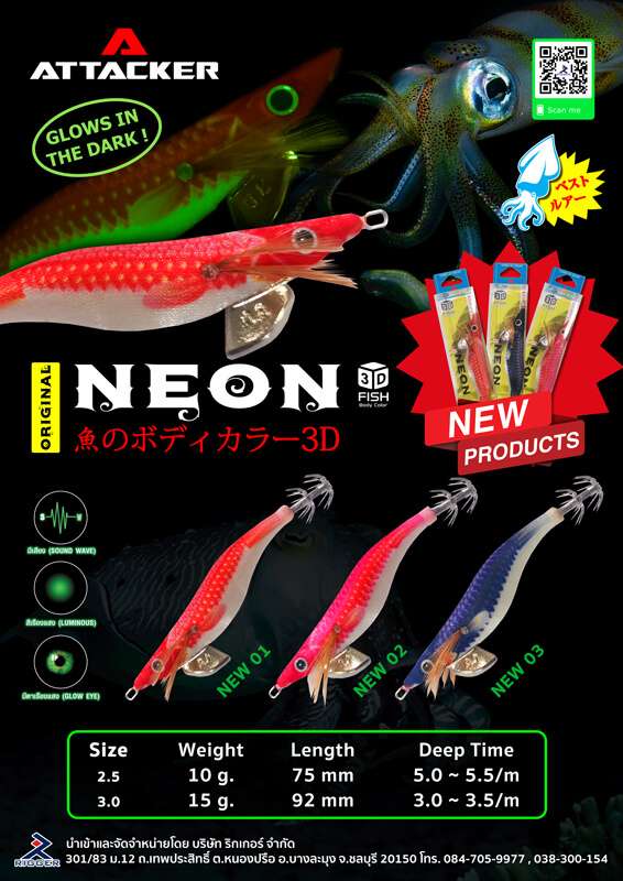 โยกุ้งตกหมึก ATTACKER ORIGINAL NEON SQUID JIG มีทั้งหมด 3 สี 2 ขนาด คือ 2.5 และ 3.0 เรืองแสง-เสียงดังทุกตัว ออกตกปลาหมึกเมื่อไร มีติดไว้ไม่ผิดหวัง ราคาหลักร้อยแต่คุณภาพเกินราคา รับประกันชื่อนี้ “นีออน”