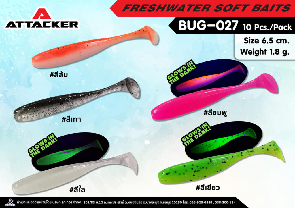 เหยื่อปลอม เหยื่อยาง ปลายาง PREMIUM SOFT BAIT BUG-027 โดยใช้เนื้อยาง TPE ที่เป็นมิตรกับสิ่งแวดล้อม มีคุณสมบัติทนทานต่อการฉีกขาด เนื้อยางของเหยื่อมีความเหนียวนุ่มและยืดหยุ่นต่อการดึง การออกแบบปลายางมีลักษณะที่คล้ายเหมือนแมลง มาพร้อมกับตัวเบ็ดเกี่ยวหนอน สามารถใช้งานได้ทันที