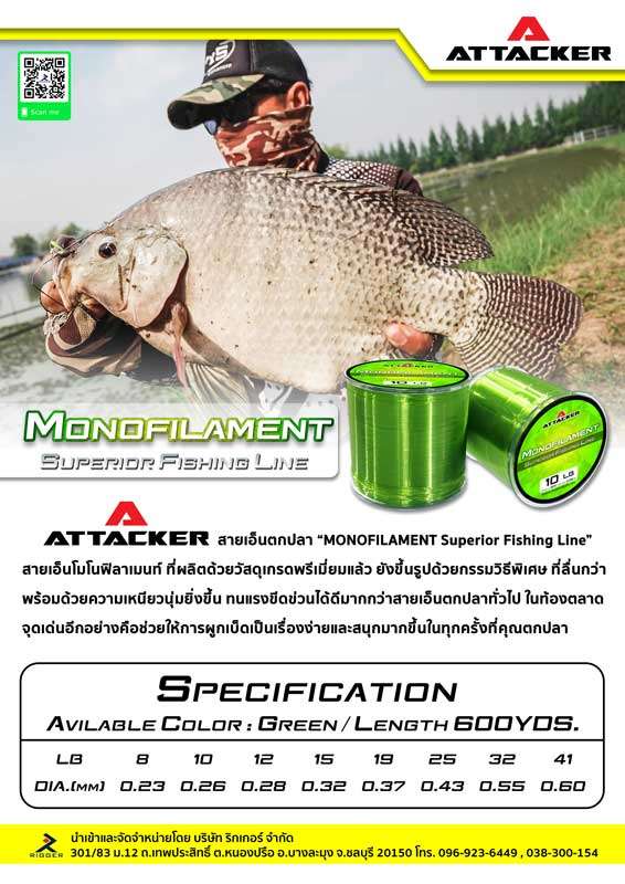 สายเอ็น MONOFILAMENT Superior Fishing Line ของ ATTACKER เหนียวนุ่มมากกว่าสายเอ็นทั่วไปในท้องตลาดและเมื่อขาดก็ไม่หงิกงอ ด้วยเส้นใยที่ถักทอจากเทคโนโลยีอันทันสมัยที่ช่วยลดความตกใจของปลา ในยามที่ทำการเหวี่ยงออกไปให้ความลื่นไหลและนุ่มนวล